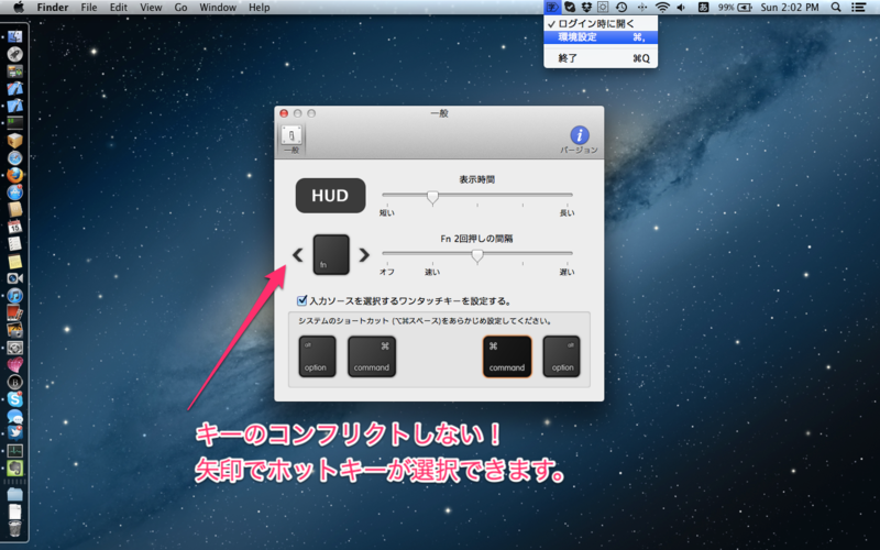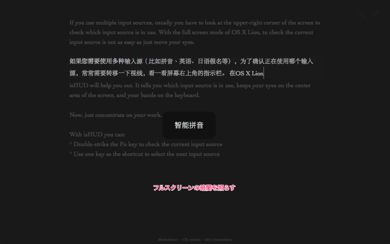 もしあなたが複数言語の入力ソース(例えばカタカナ/ひらがな、英語、簡体中国語等)を使っているなら、 作業中に今どの言語を使っているかを確認するために、視線をスクリーンの右上に移して確認する必要があります。 特にOS X Lionのフルスクリーンモードに入ると、メニューバーが隠れるために現在使用している入力ソースを確認するのは 面倒ではないでしょうか?
